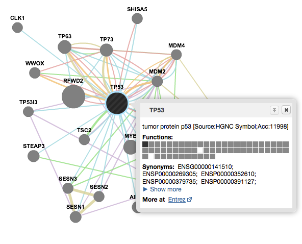 GeneMANIA finds other genes that are related to a set of input genes, using a very large set of functional association data. Association data include protein and genetic interactions, pathways, co-expression, co-localization and protein domain similarity.